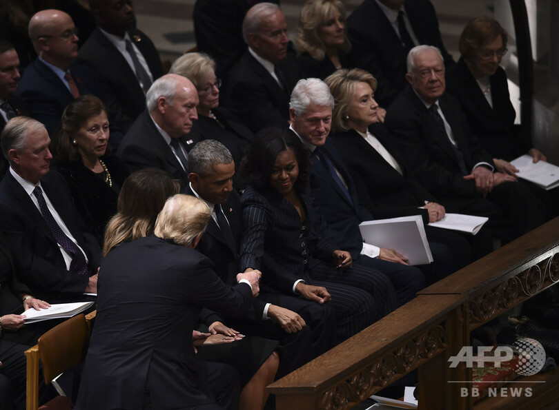 W・ブッシュ氏は国葬の会場となったワシントン大聖堂(Washington National Cathedral)に到着すると、まずドナルド・トランプ(Donald Trump)米大統領とメラニア(Melania Trump)大統領夫人と握手。続いてバラク・オバマ(Barack Obama)前大統領とミシェル(Michelle Obama)前大統領夫人と握手し、その際にキャンディーとみられるものを同夫人に手渡し、夫人の笑いを誘った。