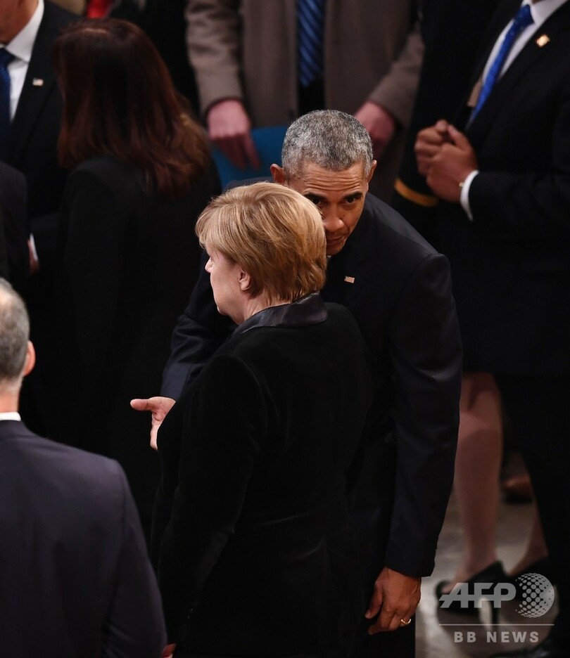 W・ブッシュ氏は国葬の会場となったワシントン大聖堂(Washington National Cathedral)に到着すると、まずドナルド・トランプ(Donald Trump)米大統領とメラニア(Melania Trump)大統領夫人と握手。続いてバラク・オバマ(Barack Obama)前大統領とミシェル(Michelle Obama)前大統領夫人と握手し、その際にキャンディーとみられるものを同夫人に手渡し、夫人の笑いを誘った。