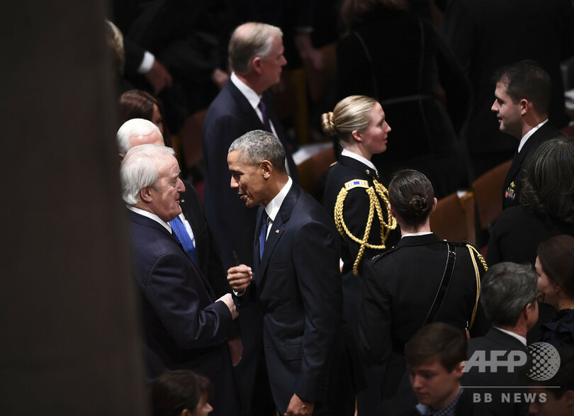W・ブッシュ氏は国葬の会場となったワシントン大聖堂(Washington National Cathedral)に到着すると、まずドナルド・トランプ(Donald Trump)米大統領とメラニア(Melania Trump)大統領夫人と握手。続いてバラク・オバマ(Barack Obama)前大統領とミシェル(Michelle Obama)前大統領夫人と握手し、その際にキャンディーとみられるものを同夫人に手渡し、夫人の笑いを誘った。