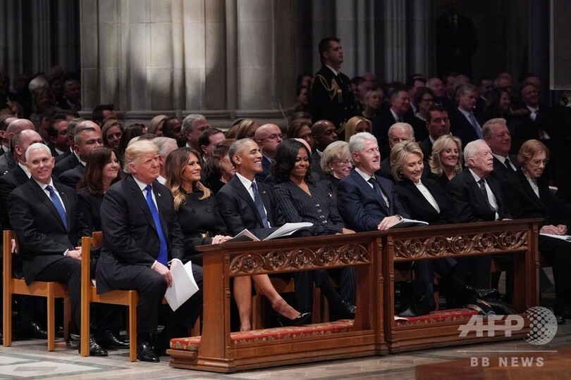 W・ブッシュ氏は国葬の会場となったワシントン大聖堂(Washington National Cathedral)に到着すると、まずドナルド・トランプ(Donald Trump)米大統領とメラニア(Melania Trump)大統領夫人と握手。続いてバラク・オバマ(Barack Obama)前大統領とミシェル(Michelle Obama)前大統領夫人と握手し、その際にキャンディーとみられるものを同夫人に手渡し、夫人の笑いを誘った。