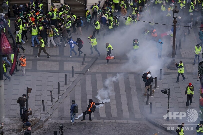 先週末に過去数十年で最悪レベルの騒乱が起きたシャンゼリゼ(Champs Elysees)通りでは、催涙ガスが立ち込める中、「マクロン、辞めろ」の声が響き渡った。