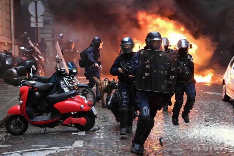 厳戒態勢が敷かれたおかげで1週間前のような大規模な破壊は免れた。とはいえ、パリ中心部で起きた暴動では装甲車が街中を走る中、象徴的な黄色いベストを着たデモ隊が、車やバリケードに火を付けたり、窓ガラスを割ったりする場面も見られた。