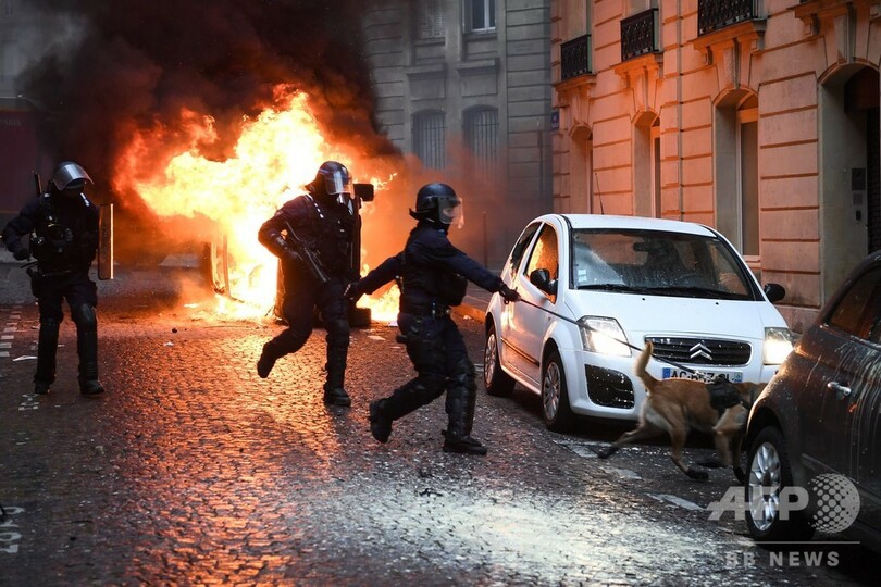 厳戒態勢が敷かれたおかげで1週間前のような大規模な破壊は免れた。とはいえ、パリ中心部で起きた暴動では装甲車が街中を走る中、象徴的な黄色いベストを着たデモ隊が、車やバリケードに火を付けたり、窓ガラスを割ったりする場面も見られた。