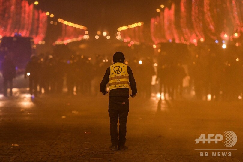 厳戒態勢が敷かれたおかげで1週間前のような大規模な破壊は免れた。とはいえ、パリ中心部で起きた暴動では装甲車が街中を走る中、象徴的な黄色いベストを着たデモ隊が、車やバリケードに火を付けたり、窓ガラスを割ったりする場面も見られた。