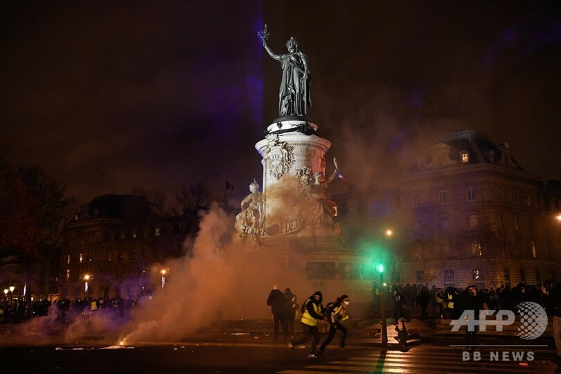 厳戒態勢が敷かれたおかげで1週間前のような大規模な破壊は免れた。とはいえ、パリ中心部で起きた暴動では装甲車が街中を走る中、象徴的な黄色いベストを着たデモ隊が、車やバリケードに火を付けたり、窓ガラスを割ったりする場面も見られた。