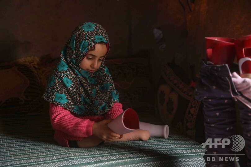 空き缶義足のシリア少女、新しい義足で避難民キャンプを歩行