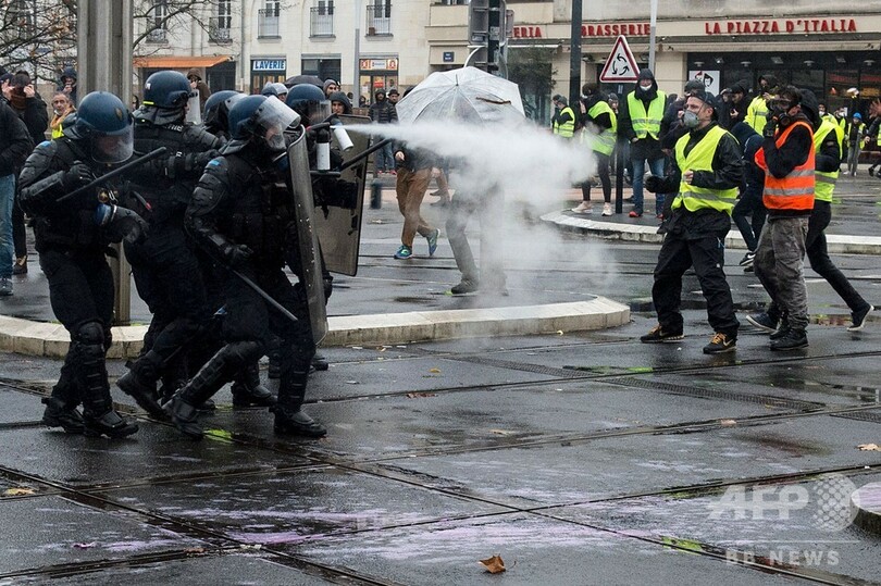 仏各地で8日に起きたジレ・ジョーヌのデモでは、全国で2000人超が拘束された。運動は周辺諸国にも飛び火し、ベルギーの首都ブリュッセルで同日あったデモでは約400人が拘束され、オランダの複数の町でも平和的な抗議活動が行われた。(c)AFP