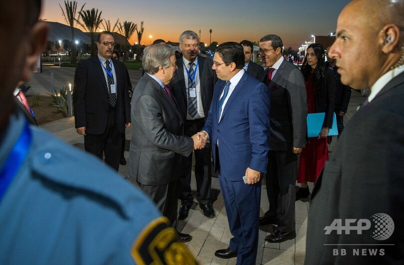 同協定は1年半にわたる協議の末、7月に国連でまとめられた。モロッコのマラケシュ(Marrakesh)で2日間にわたって開催される会合の冒頭で、約150か国の首脳や代表らが立ち会う中、正式に採択された。(c)AFP