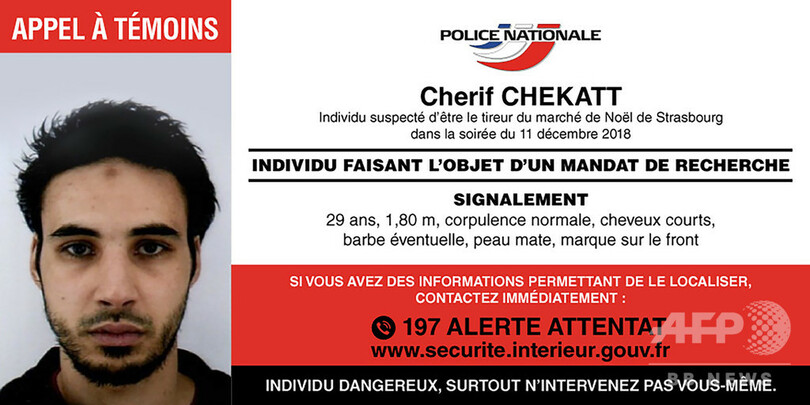ストラスブールでの事件は11日夜に発生。実行犯とされるシェリフ・シェカット(Cherif Chekatt)容疑者(29)は逃走していたが、13日にフランス警察に射殺された。(c)AFP