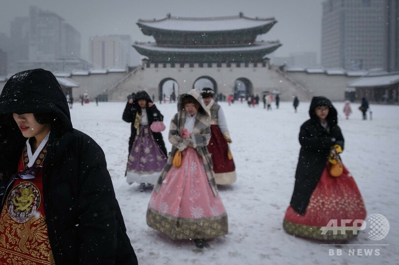 雪が舞う中、伝統衣装「韓服(ハンボク、Hanbok)」に身を包んだ女性、雪かきをする労働者らの姿が見られた。(c)AFP