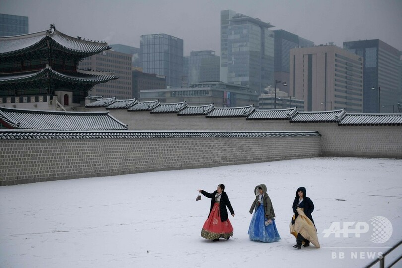 雪が舞う中、伝統衣装「韓服(ハンボク、Hanbok)」に身を包んだ女性、雪かきをする労働者らの姿が見られた。(c)AFP