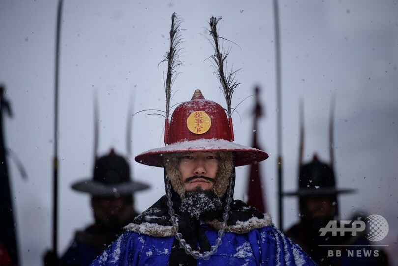 雪が舞う中、伝統衣装「韓服(ハンボク、Hanbok)」に身を包んだ女性、雪かきをする労働者らの姿が見られた。(c)AFP