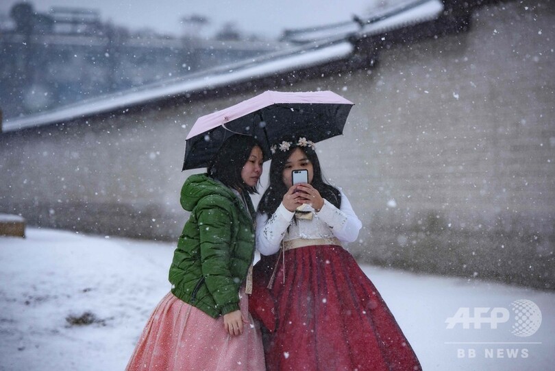 雪が舞う中、伝統衣装「韓服(ハンボク、Hanbok)」に身を包んだ女性、雪かきをする労働者らの姿が見られた。(c)AFP