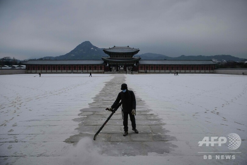 雪が舞う中、伝統衣装「韓服(ハンボク、Hanbok)」に身を包んだ女性、雪かきをする労働者らの姿が見られた。(c)AFP