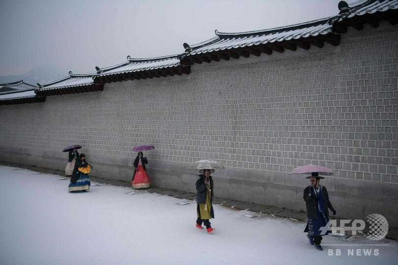 雪が舞う中、伝統衣装「韓服(ハンボク、Hanbok)」に身を包んだ女性、雪かきをする労働者らの姿が見られた。(c)AFP