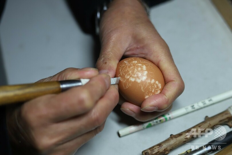 卵の殻も段さんの手にかかれば、美しい芸術作品へと変貌する。段さんは14年間で1000点近い「卵彫刻」作品を作り上げている。(c)CNS/JCM/AFPBB News
