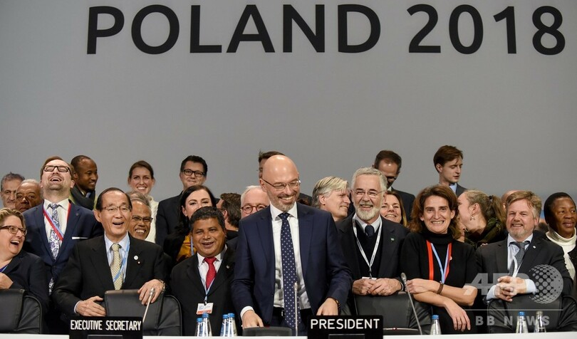 【12月16日 AFP】ポーランド南部カトウィツェ(Katowice)で開催された国連気候変動枠組み条約第24回締約国会議(COP24)は16日、2015年に結ばれた地球温暖化対策の国際枠組み「パリ協定(Paris Agreement)」の運用ルールを採択した。パリ協定は、世界の気温上昇幅を産業革命以前と比べて2度未満に、可能であれば1.5度未満に抑えることを目標としている。