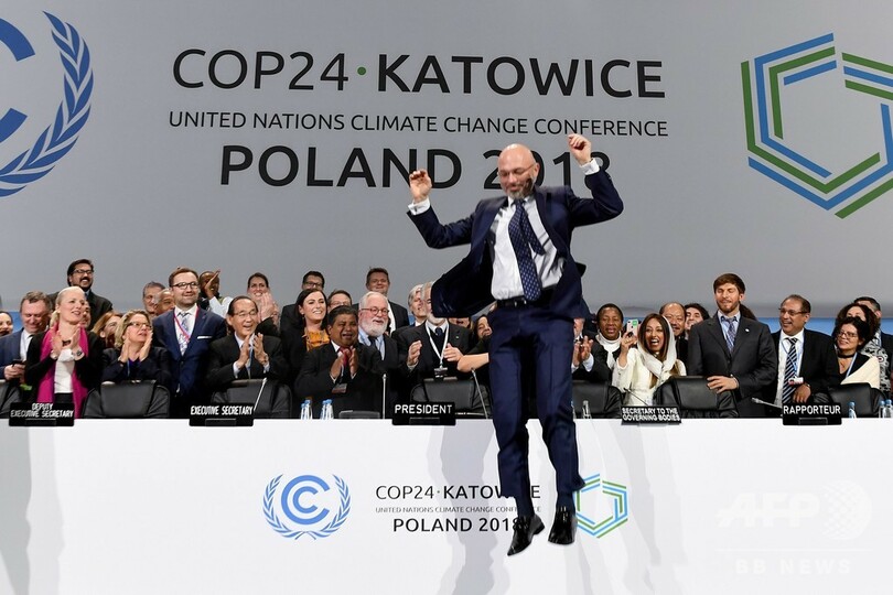【12月16日 AFP】ポーランド南部カトウィツェ(Katowice)で開催された国連気候変動枠組み条約第24回締約国会議(COP24)は16日、2015年に結ばれた地球温暖化対策の国際枠組み「パリ協定(Paris Agreement)」の運用ルールを採択した。パリ協定は、世界の気温上昇幅を産業革命以前と比べて2度未満に、可能であれば1.5度未満に抑えることを目標としている。