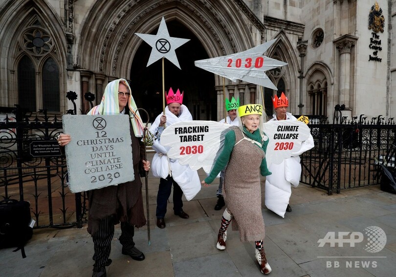 【12月20日 AFP】英ファッションデザイナーのヴィヴィアン・ウエストウッド(Vivienne Westwood)さんが18日、英ロンドン中心部にある王立裁判所(Royal Courts of Justice)の前で水圧破砕法(フラッキング)によるシェールガス開発に反対する抗議活動を行った。