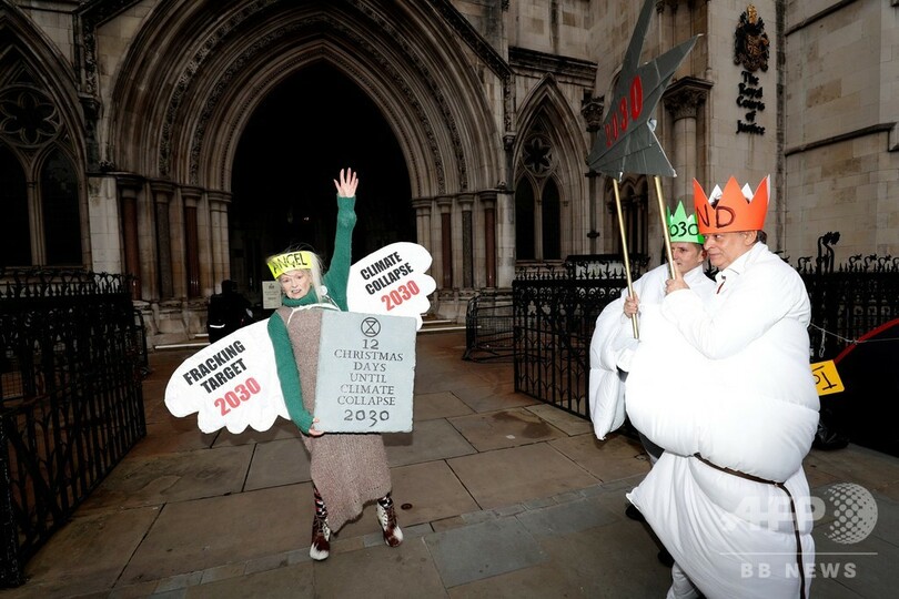 天使姿のウエストウッドさんは、新約聖書に登場する聖ヨセフと東方の三博士に扮(ふん)した環境活動家と共に、英政府のシェールガス開発手引書は違法だと訴えた。ウエストウッドさんは反フラッキング活動団体「トーク・フラッキング(Talk Fracking)」の一員で、環境活動家としても知られている。(c)AFP