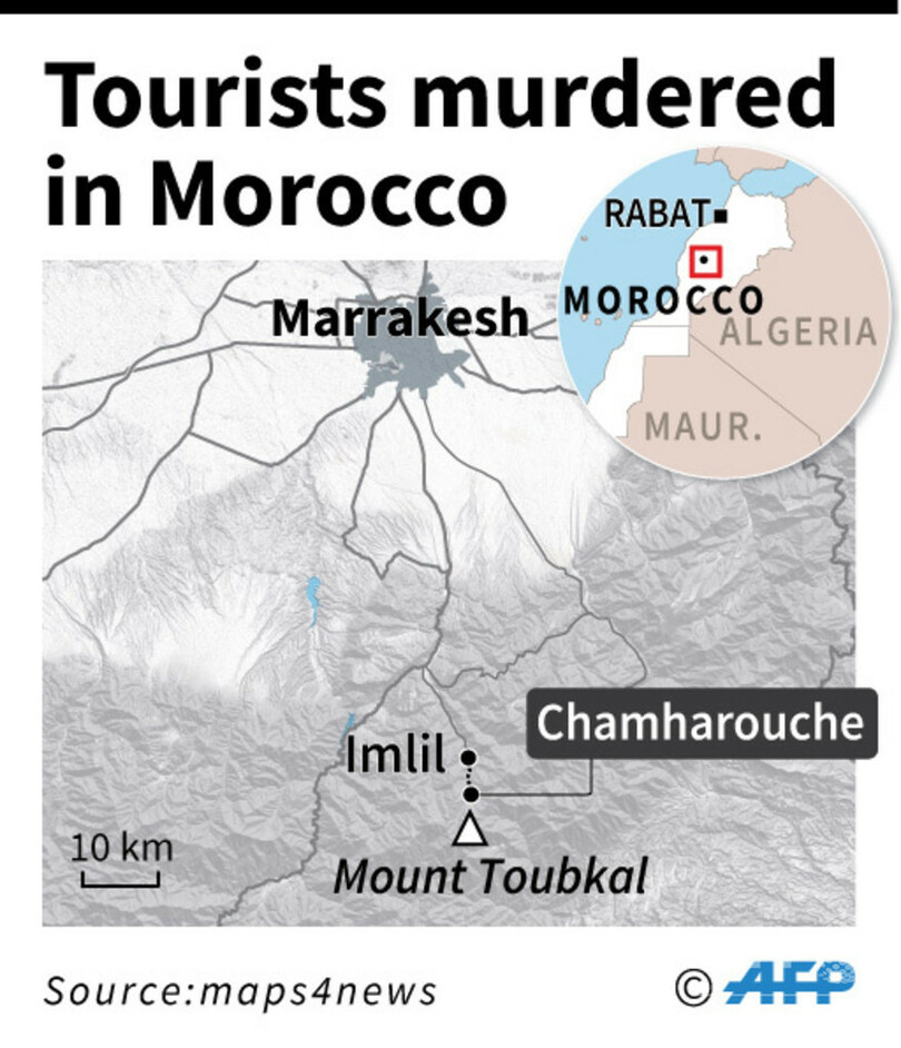 殺害されたのは、デンマーク人女性(24)とノルウェー人女性(28)。遺体は17日、高アトラス(High Atlas)山脈にある観光地の村イムリル(Imlil)から10キロ離れたキャンプ場で発見された。同村は登山の出発点として知られ、2人はキャンプ場にテントを張って滞在していた。