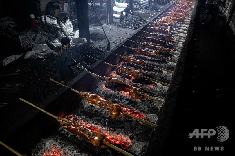 【12月22日 AFP】竹で串刺しにされた子豚がオレンジ色の炎の上にずらりと並べられ、ジュージューと音を立てている――クリスマスを数日後に控えたフィリピンの首都マニラでは、名物料理の「レチョン(lechon)」作りがピークを迎えている。