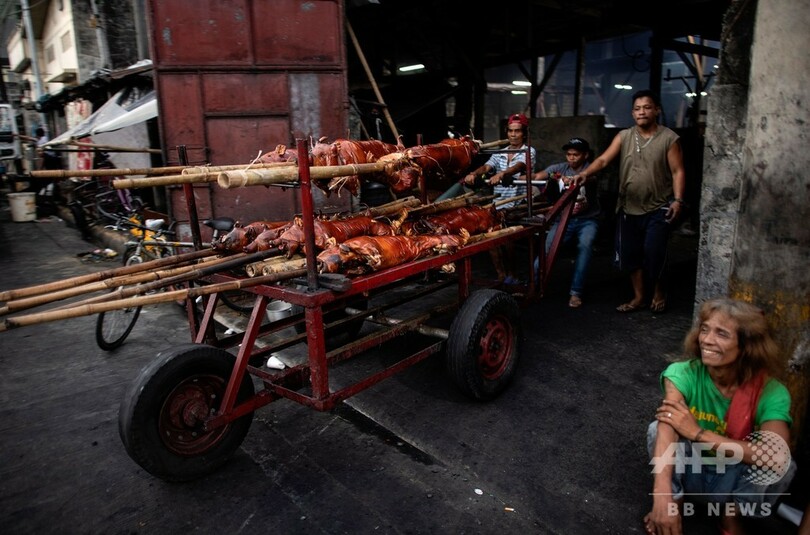 【12月22日 AFP】竹で串刺しにされた子豚がオレンジ色の炎の上にずらりと並べられ、ジュージューと音を立てている――クリスマスを数日後に控えたフィリピンの首都マニラでは、名物料理の「レチョン(lechon)」作りがピークを迎えている。