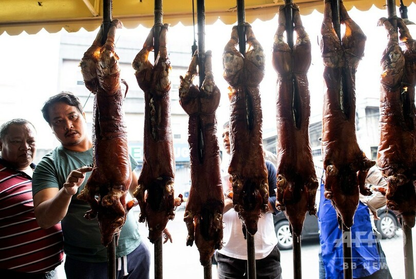 【12月22日 AFP】竹で串刺しにされた子豚がオレンジ色の炎の上にずらりと並べられ、ジュージューと音を立てている――クリスマスを数日後に控えたフィリピンの首都マニラでは、名物料理の「レチョン(lechon)」作りがピークを迎えている。