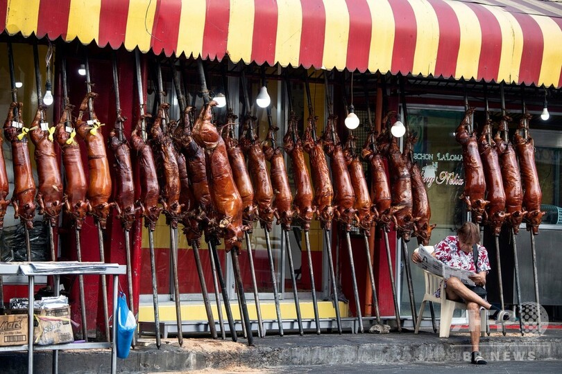 【12月22日 AFP】竹で串刺しにされた子豚がオレンジ色の炎の上にずらりと並べられ、ジュージューと音を立てている――クリスマスを数日後に控えたフィリピンの首都マニラでは、名物料理の「レチョン(lechon)」作りがピークを迎えている。