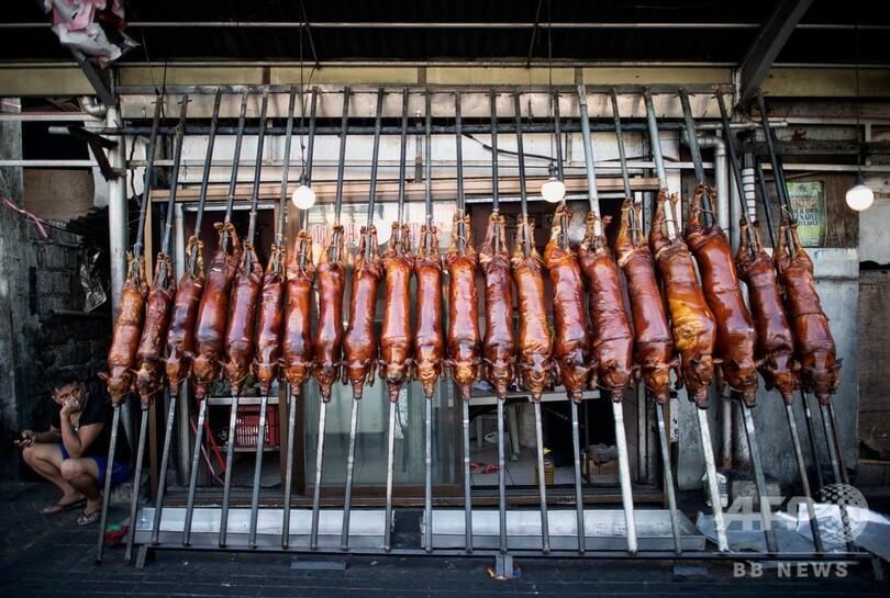 【12月22日 AFP】竹で串刺しにされた子豚がオレンジ色の炎の上にずらりと並べられ、ジュージューと音を立てている――クリスマスを数日後に控えたフィリピンの首都マニラでは、名物料理の「レチョン(lechon)」作りがピークを迎えている。