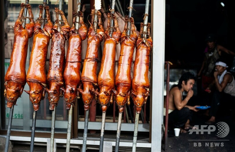 【12月22日 AFP】竹で串刺しにされた子豚がオレンジ色の炎の上にずらりと並べられ、ジュージューと音を立てている――クリスマスを数日後に控えたフィリピンの首都マニラでは、名物料理の「レチョン(lechon)」作りがピークを迎えている。