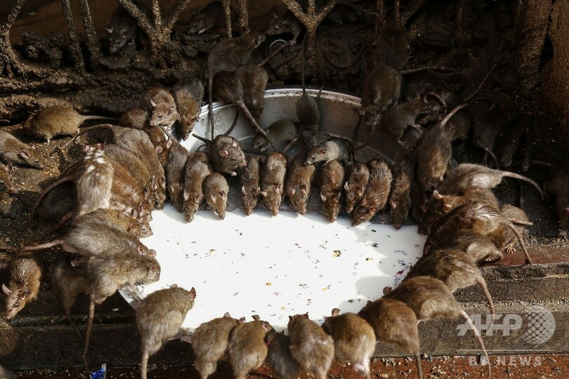 信者らは寺院にいるネズミに祈りをささげミルクを供えることで、家族のみならず、広く社会に幸をもたらすと伝統的に信じられている。(c)AFP