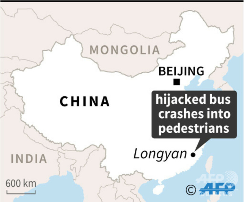 【12月25日 AFP】(更新、写真追加)中国東部・福建(Fujian)省で25日午後、乗っ取られたバスが歩行者らに突っ込み、8人が死亡、22人が負傷した。国営メディアが報じた。