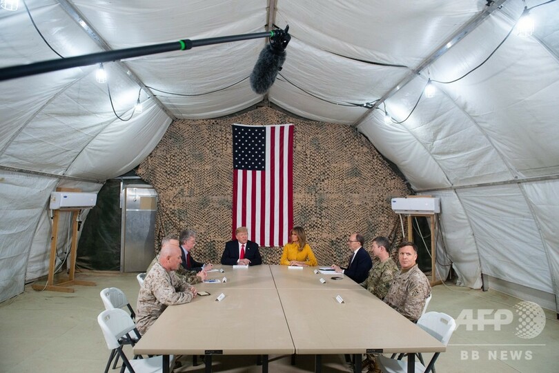 米政府では2001年9月11日の米同時多発攻撃以降、海外駐留部隊の激励を目的とした訪問は歴代大統領の慣例となっているが、これまで戦地訪問を行っていなかったトランプ氏は大きな批判を浴びていた。(c)AFP