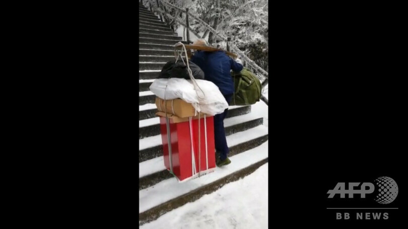 動画に映る白髪の男性は、天秤棒の両脇に食料や消防器材などをひもで結び、雪の降り積もる石階段をゆっくりと登っている。男性の名は、方銀善(Fang Yinshan)さん(53)。黄山の中腹から、景観スポットの一つ迎客松(Yingkesong)までの7.5キロの山路を33年間登り続けている。