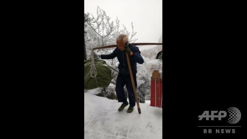 動画に映る白髪の男性は、天秤棒の両脇に食料や消防器材などをひもで結び、雪の降り積もる石階段をゆっくりと登っている。男性の名は、方銀善(Fang Yinshan)さん(53)。黄山の中腹から、景観スポットの一つ迎客松(Yingkesong)までの7.5キロの山路を33年間登り続けている。