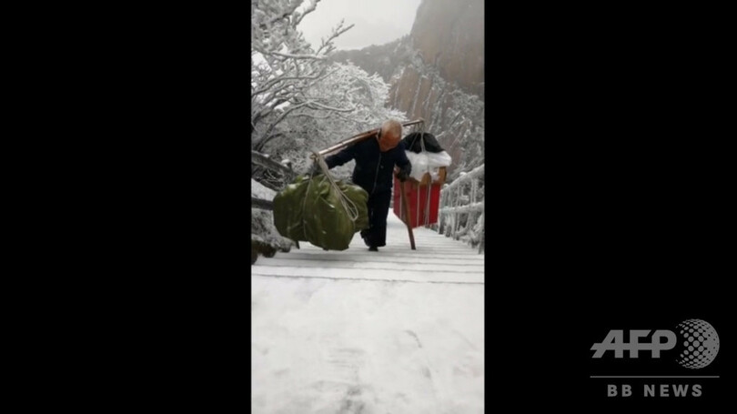 動画に映る白髪の男性は、天秤棒の両脇に食料や消防器材などをひもで結び、雪の降り積もる石階段をゆっくりと登っている。男性の名は、方銀善(Fang Yinshan)さん(53)。黄山の中腹から、景観スポットの一つ迎客松(Yingkesong)までの7.5キロの山路を33年間登り続けている。
