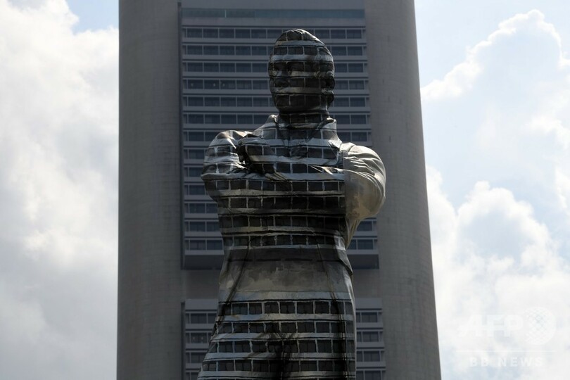 【1月4日 AFP】英国人スタンフォード・ラッフルズ(Stamford Raffles)が上陸してから今年で200年を迎えるシンガポールで3日、記念イベントの一環で背後のビルに溶け込むようなペイントが施されたラッフルズ像が登場した。(c)AFP