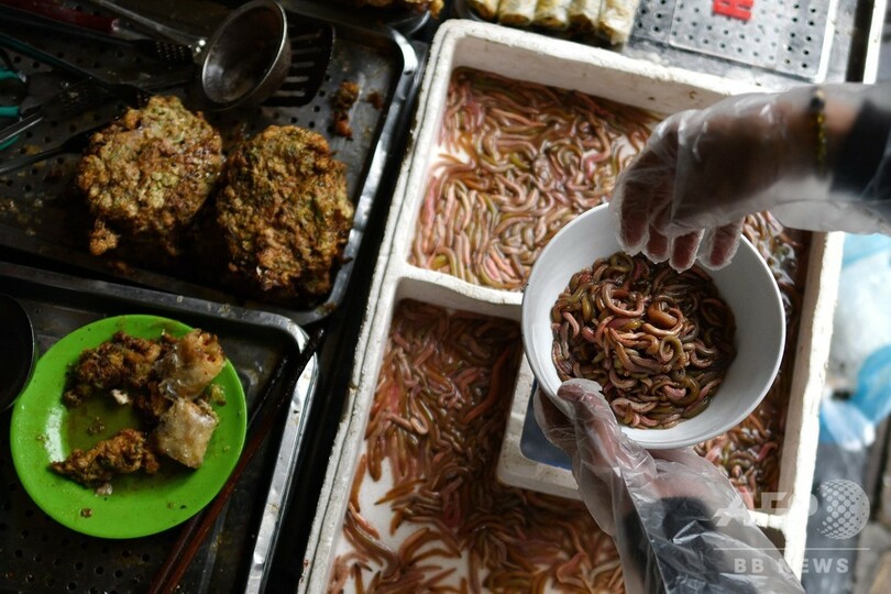 この軽食をおよそ1個1ドル(約110円)で販売している屋台の店主たちは、中に詰まったくねくねしたゴカイを嫌がらないでと、客に声を掛けている。