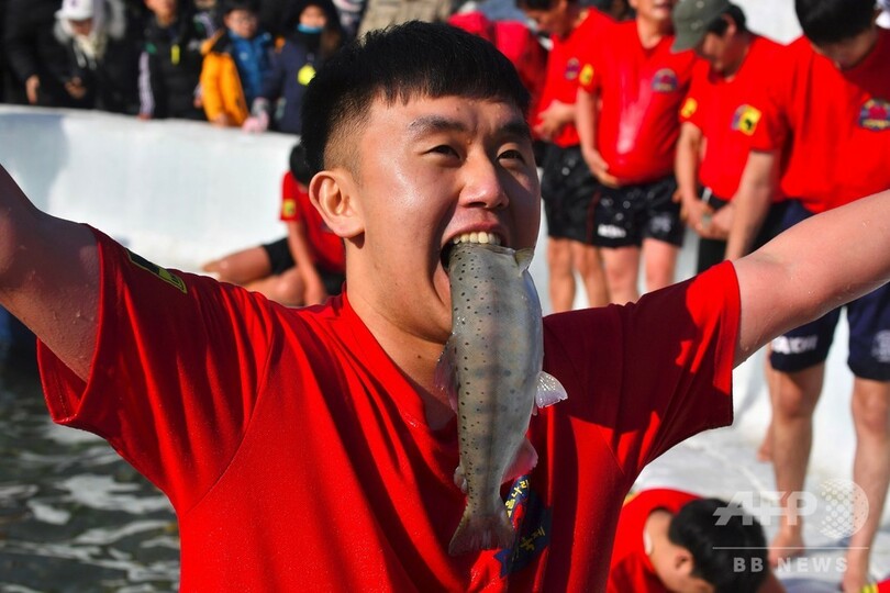 恒例のヤマメ祭り、氷上で穴釣り つかみ取りも 韓国・華川