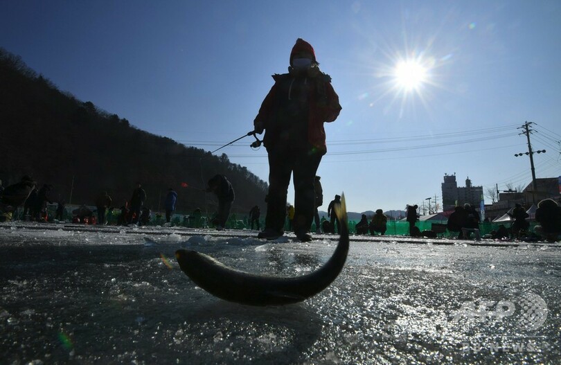 恒例のヤマメ祭り、氷上で穴釣り つかみ取りも 韓国・華川