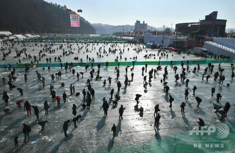 恒例のヤマメ祭り、氷上で穴釣り つかみ取りも 韓国・華川