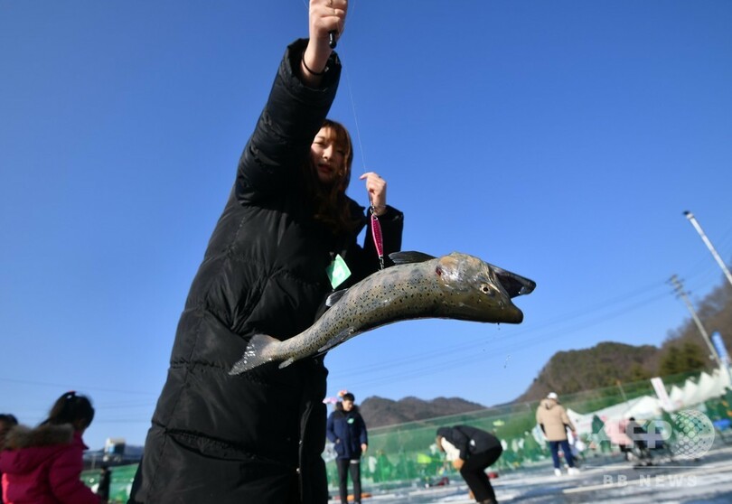 恒例のヤマメ祭り、氷上で穴釣り つかみ取りも 韓国・華川