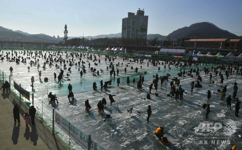 恒例のヤマメ祭り、氷上で穴釣り つかみ取りも 韓国・華川