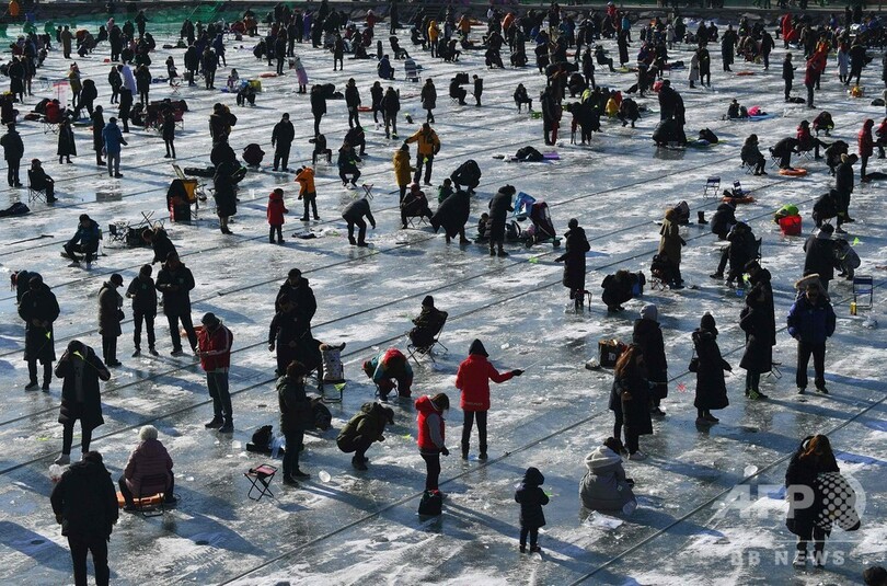 恒例のヤマメ祭り、氷上で穴釣り つかみ取りも 韓国・華川