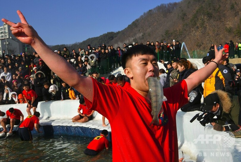 恒例のヤマメ祭り、氷上で穴釣り つかみ取りも 韓国・華川