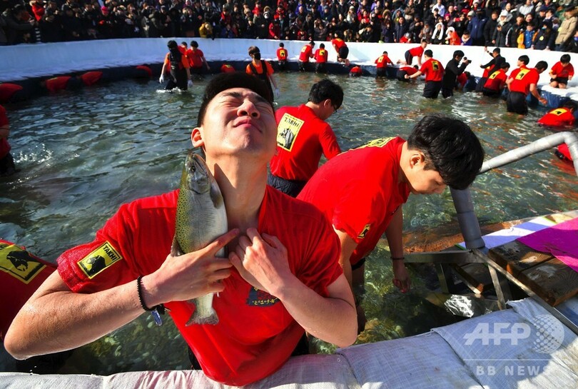 恒例のヤマメ祭り、氷上で穴釣り つかみ取りも 韓国・華川