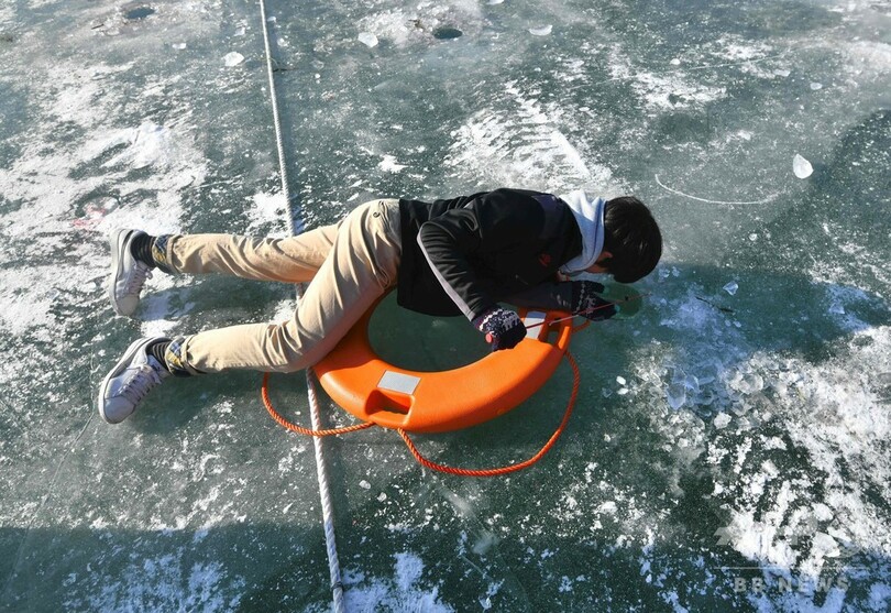 恒例のヤマメ祭り、氷上で穴釣り つかみ取りも 韓国・華川
