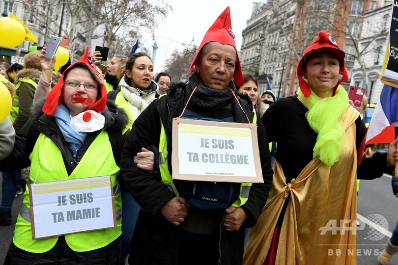 【1月7日 AFP】燃料税引き上げへの抗議を発端に8週目に突入した「ジレ・ジョーヌ(黄色いベスト、gilets jaunes)」運動の暴徒化に揺れるフランスで、女性たちが6日、暴力的な活動家から本来の平和なデモを取り戻そうと訴えてパリ市内を行進した。