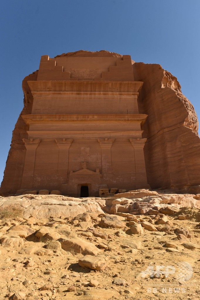 【1月8日 AFP】サウジアラビア北西部アルウラ(al-Ula)近郊、国連教育科学文化機関(UNESCO、ユネスコ)の世界遺産アルヒジュル古代遺跡(マダインサーレハ、Madain Saleh)にある、バラ色の砂岩に装飾を施した墓石、カスル・アル・ファリード(Qasr al-Farid、孤独な宮殿の意)。(c)AFP